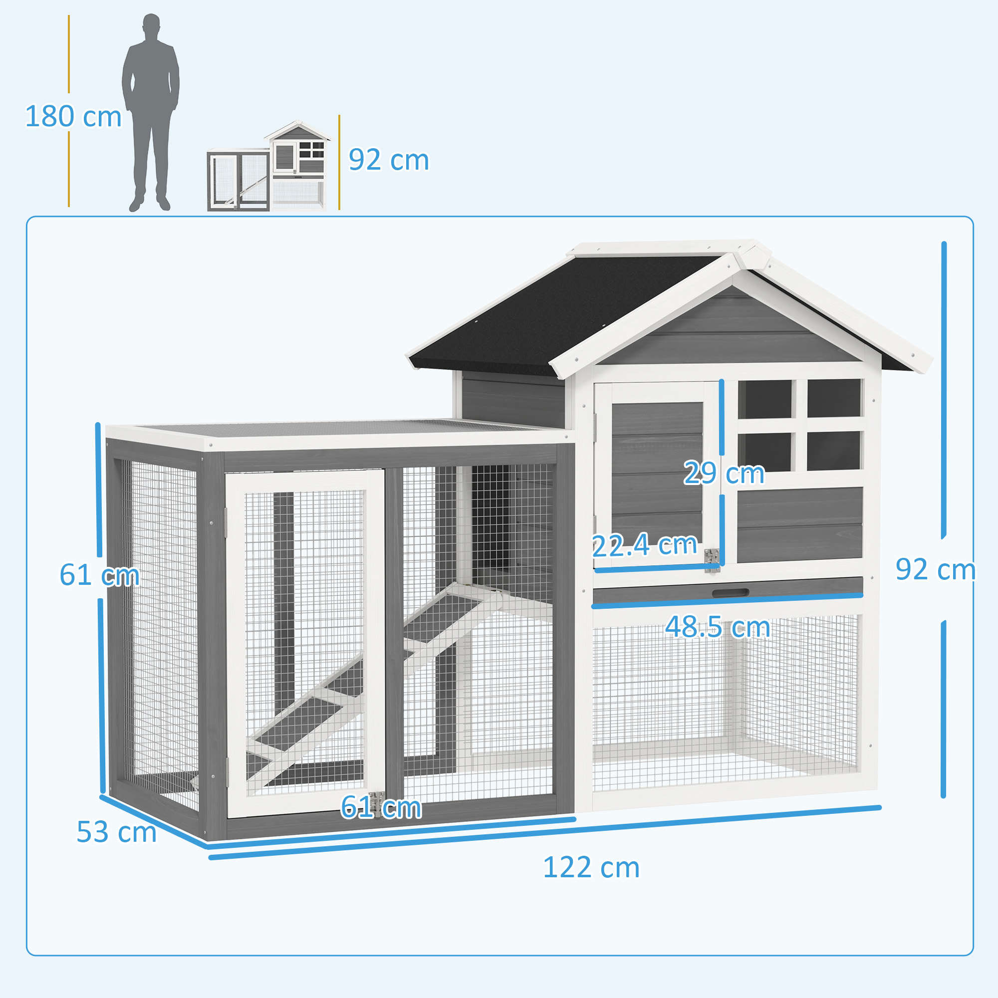 - SPATIOASA: Aceasta cusca pentru iepuri ofera spatiu generos, fiind compartimentata pe doua niveluri. Partea inferioara este dedicata activitatii si jocului, iar partea superioara include o coliba confortabila pentru odihna.
