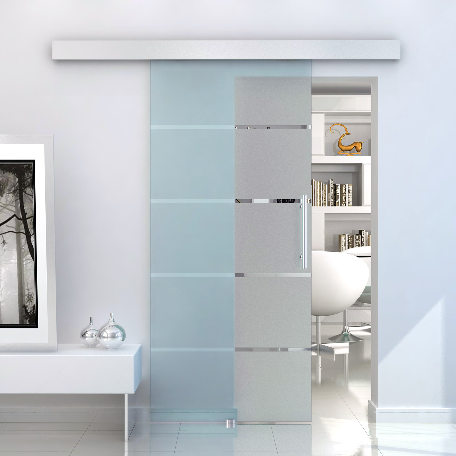 - Dispune de o șină superioară și o clemă inferioară care previn oscilațiile. Ușa glisantă trebuie montată pe o bază solidă, având nevoie de un spațiu minim de 218 cm de la podea până la tavan pentru o instalare corectă.