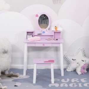 - CREAT PENTRU COPII: Acest set de masa de toaleta cu oglinda si scaun, cu dimensiuni de 60x34x93 cm, este conceput special pentru micile printese, oferindu-le un loc dedicat pentru a se aranja si a se pieptana.