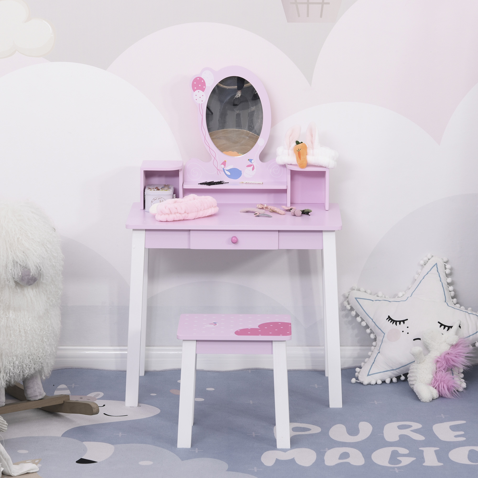 - DESIGN ATRĂGĂTOR: Cu un design fermecător în nuanțe de roz și alb, acest set va adăuga o notă de eleganță în camera copilului. Oglinda este decorată cu zâne colorate, aducând un strop de magie.