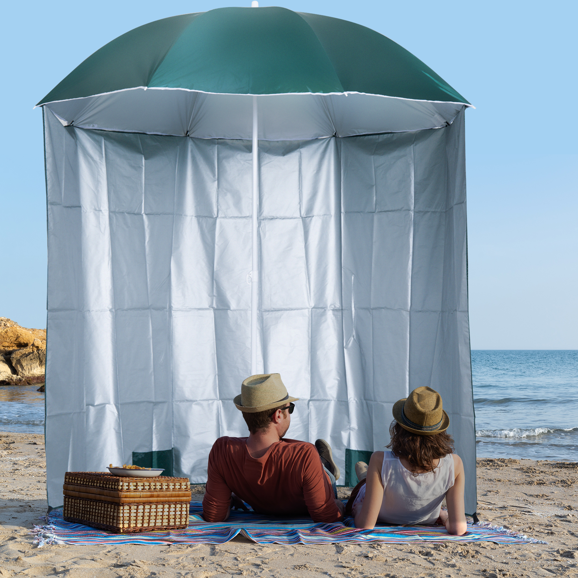 - PACHET COMPLET: Umbrela cu cort vine cu 2 saci de nisip și 2 pichete pentru o stabilitate crescută, chiar și fără o bază solidă. Este perfectă pentru picnicuri, lângă apă sau pe plajă.